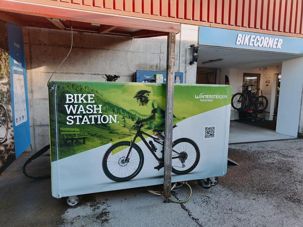 Die Bike-Waschanlage von Wintersteiger ist neben unserem Eingang installiert und auch nach Ladenschluss in Betrieb. Sie arbeitet mit Niederdruck und schont so die Lager.